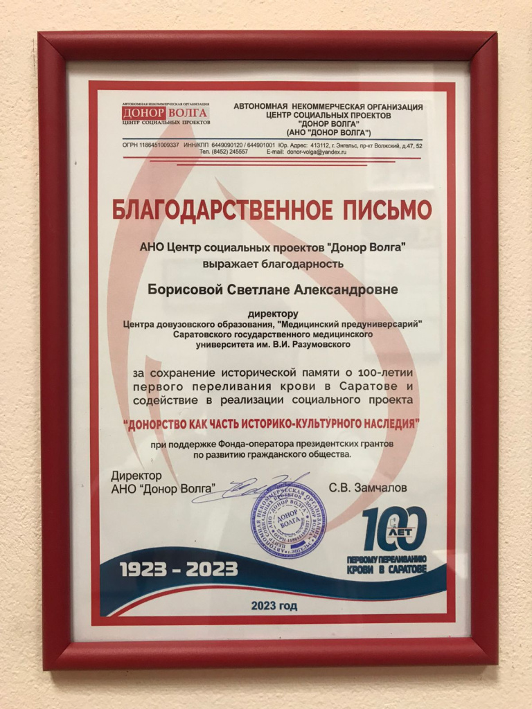 14 июня директору предуниверсария Борисовой Светлане Александровне вручено Благодарственное письмо от руководства АНО Центра социальных проектов «Донор Волга» за сохранение исторической памяти о 100-летии первого переливания крови в Саратове и содействие в реализации социального проекта «Донорство как часть историко-культурного наследия».