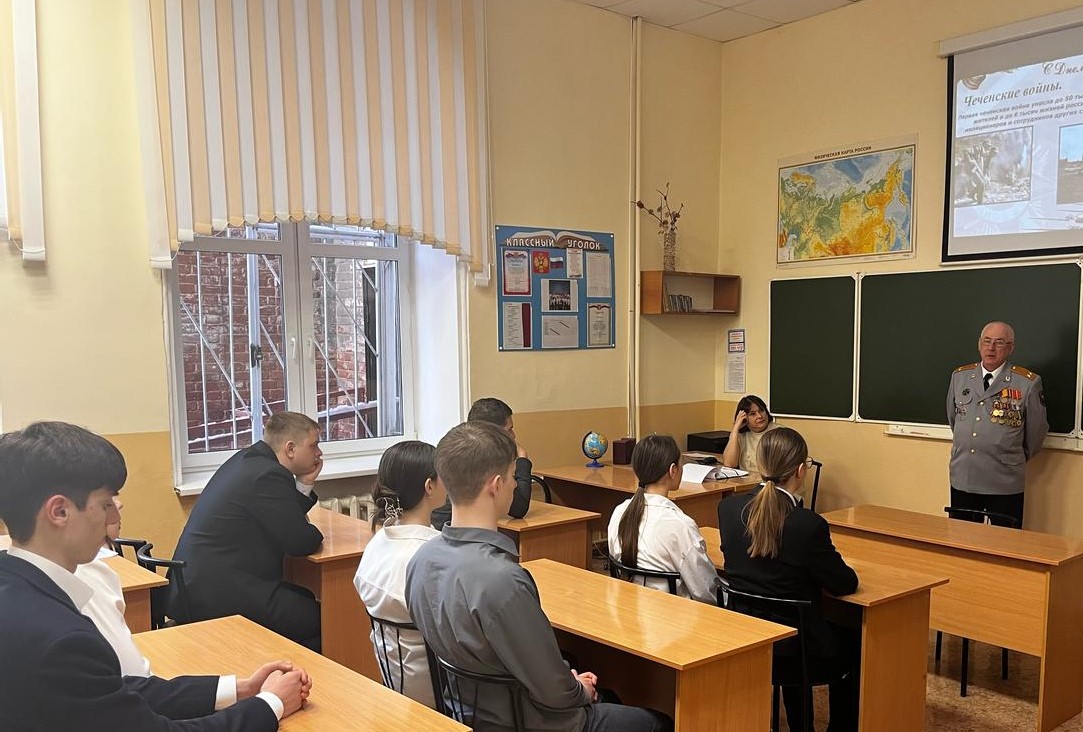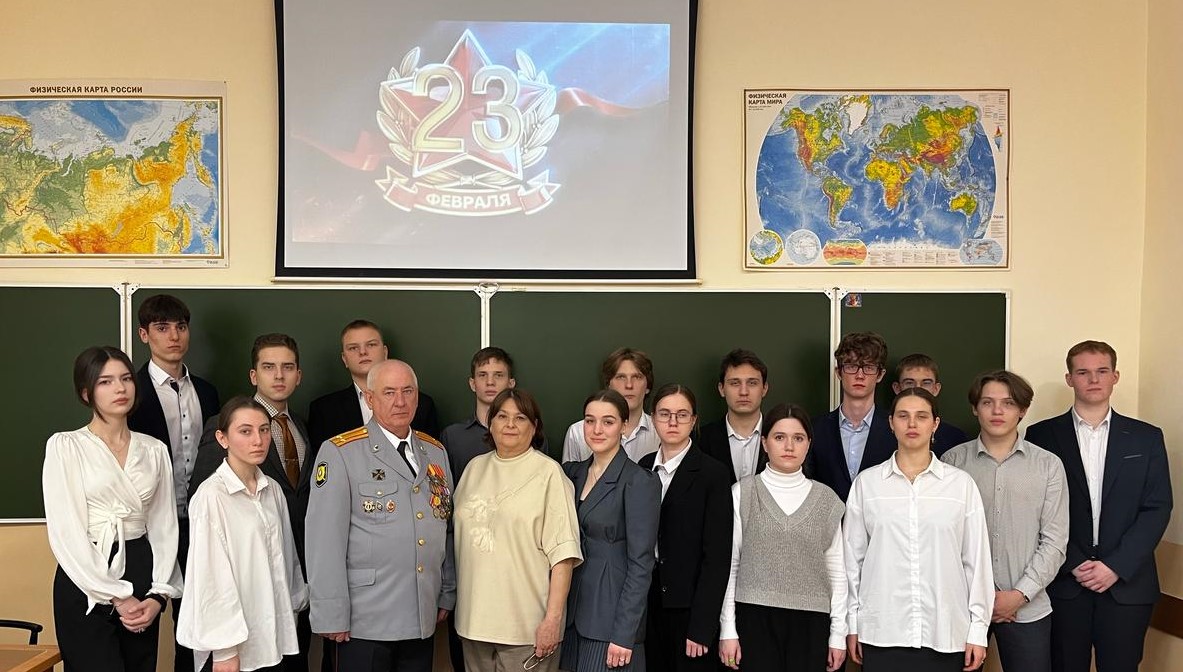 В честь празднования Дня защитника Отечества обучающиеся 11 класса провели урок мужества "Этих дней не смолкнет слава..." с приглашением ветерана боевых действий, члена Волжского отделения ВОО ВВ "Боевое Братство", члена общественной организации "Союз Саратовских курсантов", кавалера ордена Мужества старшего преподавателя кафедры Саратовского ГМУ МПЗ и МК Белоусова Михаила Юрьевича.