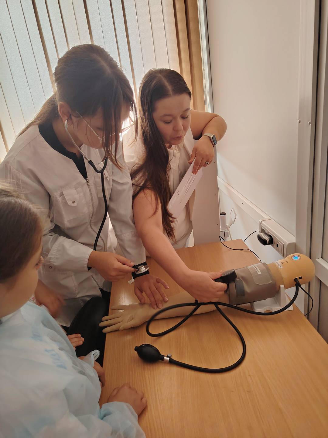 Ассистент кафедры Анна Игоревна Самсонова рассказала и наглядно показала алгоритмы оказания первой помощи при остановке дыхания и сердцебиения. Слушатели отработали практические навыки искусственной вентиляции легких и непрямого массажа сердца, а также увидели аппарат УЗИ и кювез для выхаживания недоношенных новорожденных детей.